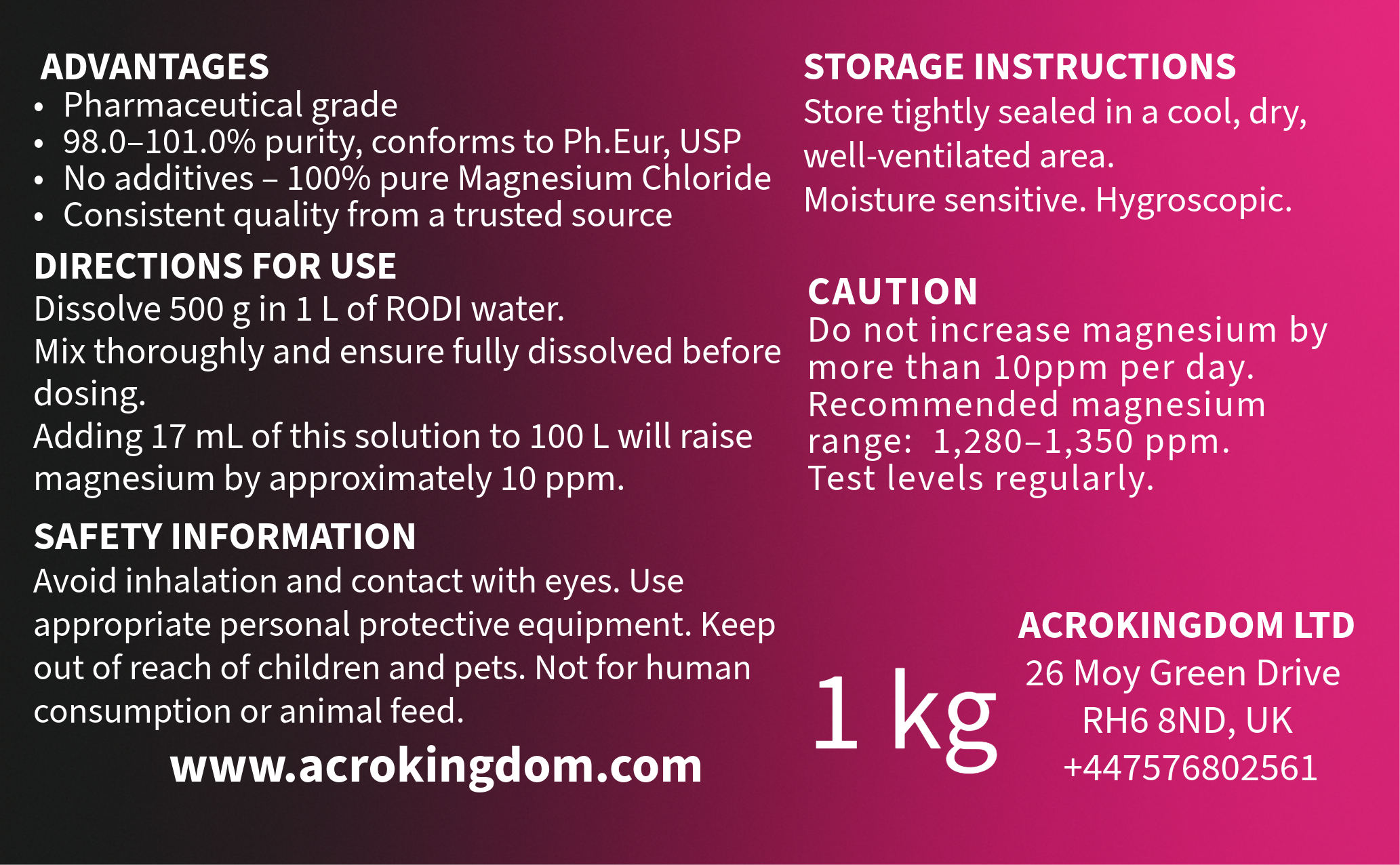 Adding 17 mL of this solution to 100 L will raise magnesium by approximately 10 ppm.